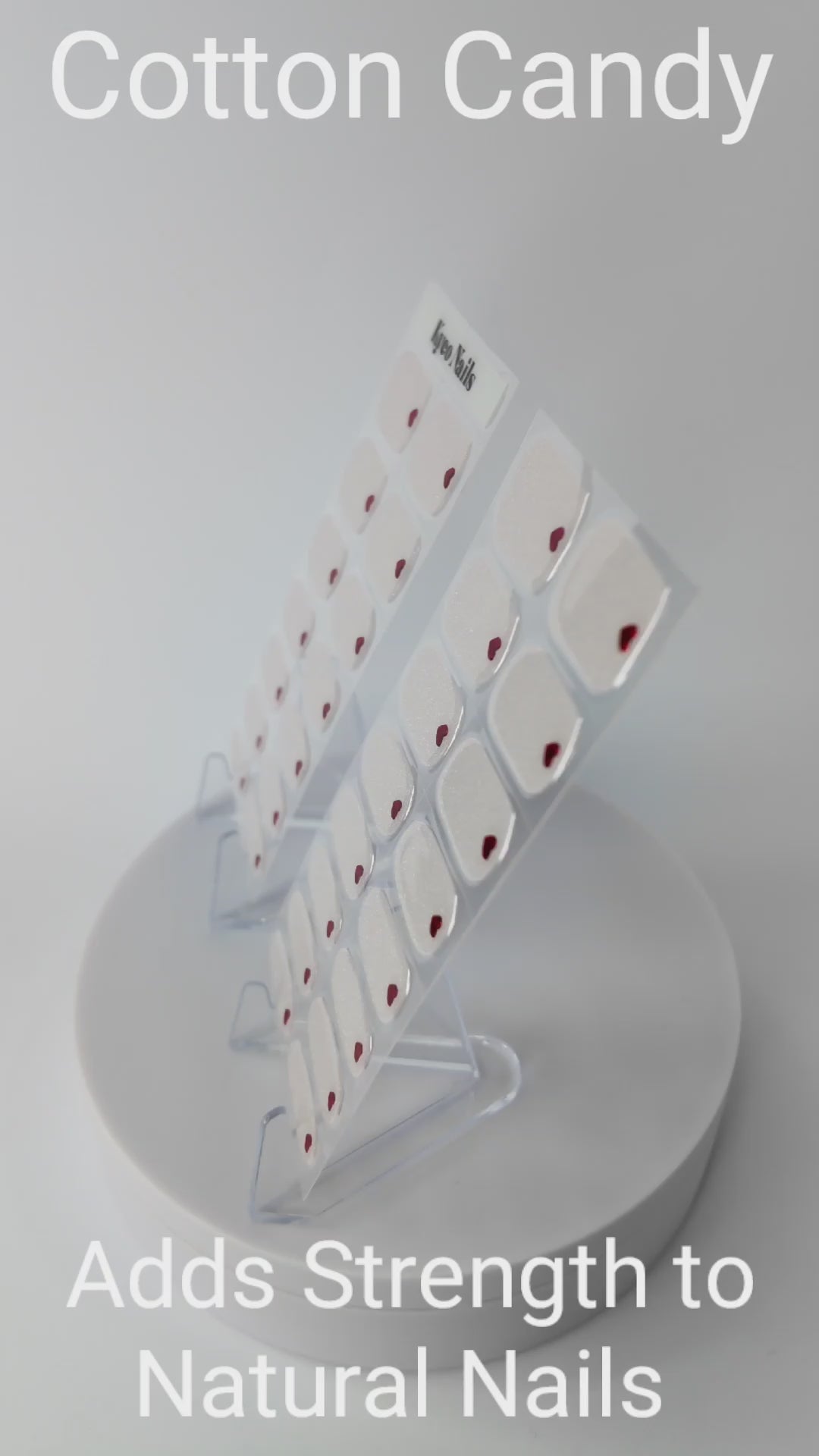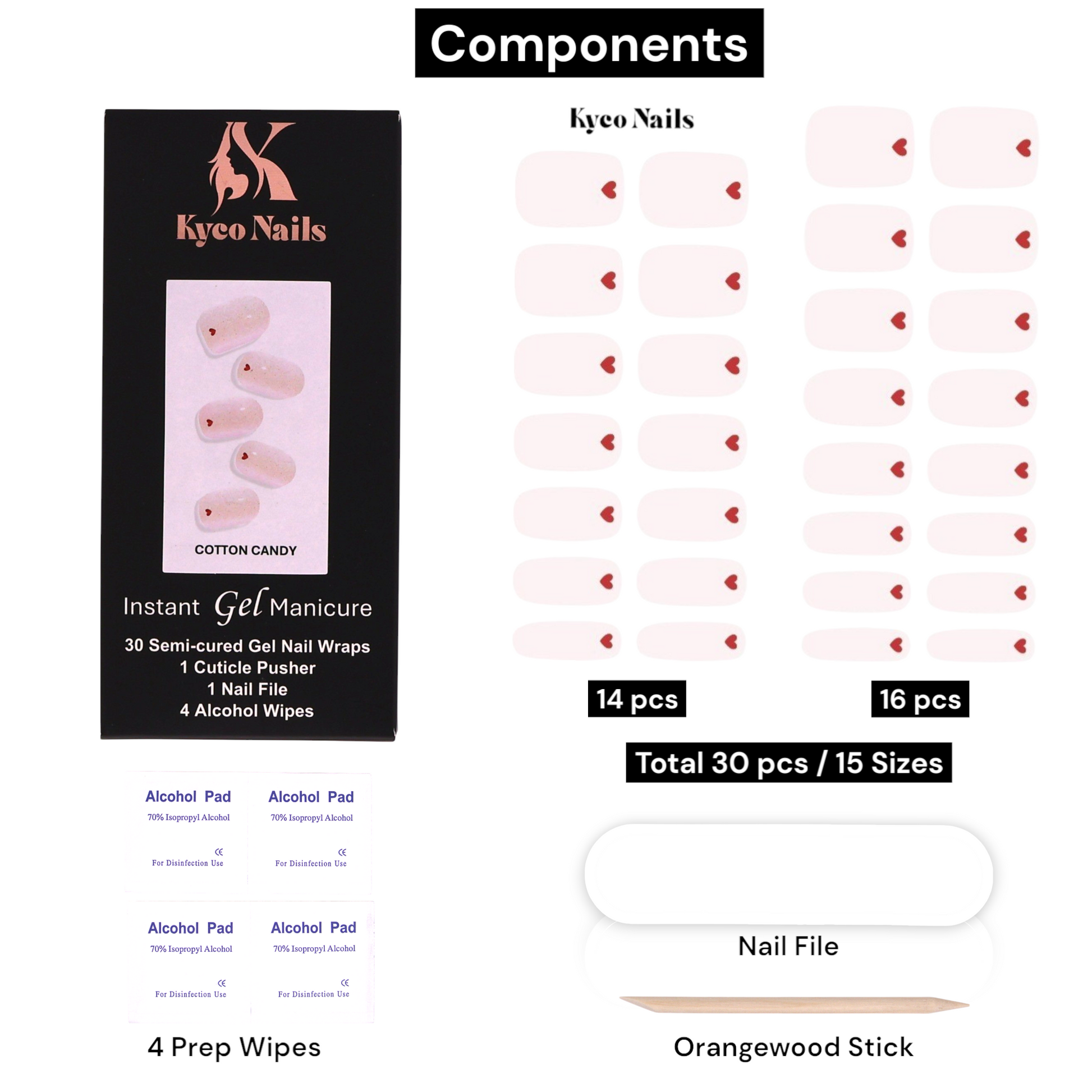 Delicate yet playful, our Cotton Candy gel polish stickers, wraps your nails in a sheer wash of soft pink and neutral tones, kissed with a luminous shimmer finish. A tiny heart detail adds a charming twist, making this wrap a must-have for romantics and minimalists alike.