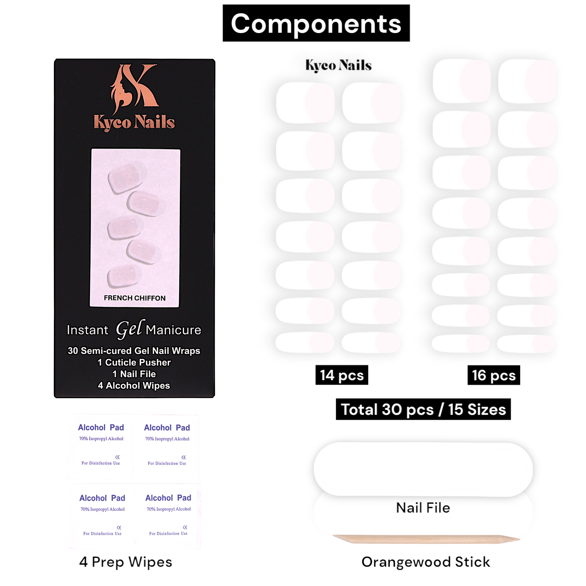The set comes complete with essential tools: a cuticle pusher, nail file, and 4 alcohol prep wipes for proper application.